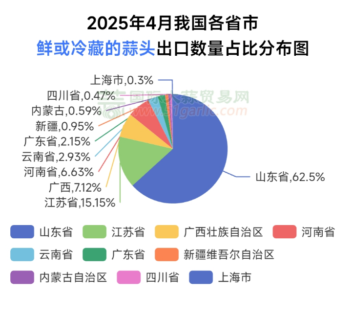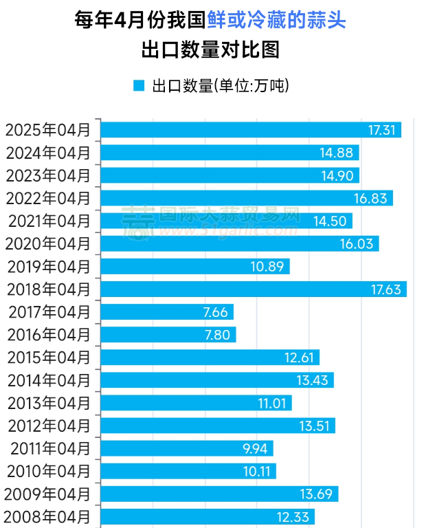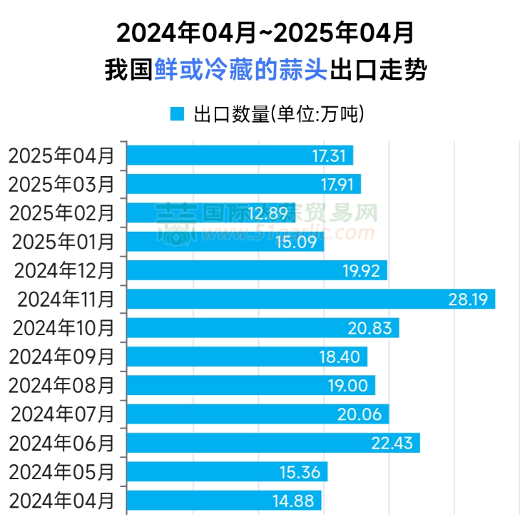 2025年4月份鮮或冷藏的蒜頭出口量約為17.31萬噸,環(huán)比下降約3.37%,同比上漲約16.29%!