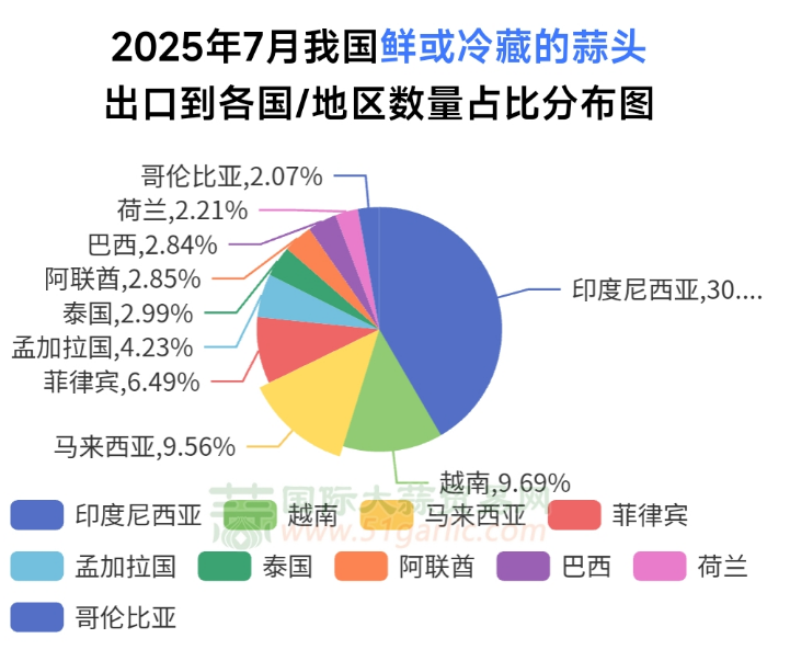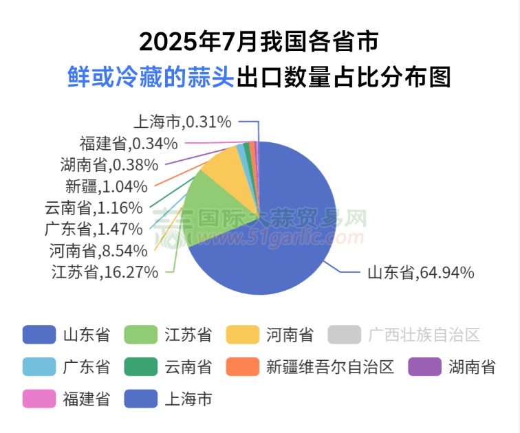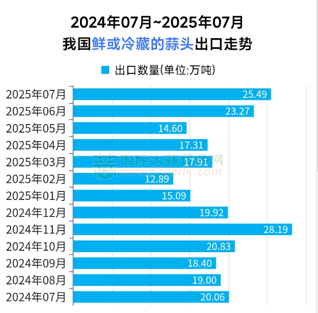 2025年7月份,我國(guó)鮮或冷藏的大蒜出口量約為25.49萬(wàn)噸,同比增加約27.08%,環(huán)比增加約9.55%!