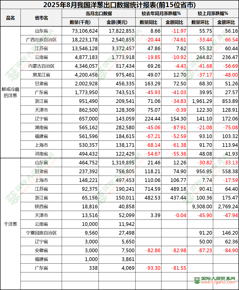 2025年8月洋蔥出口數據(按省市)