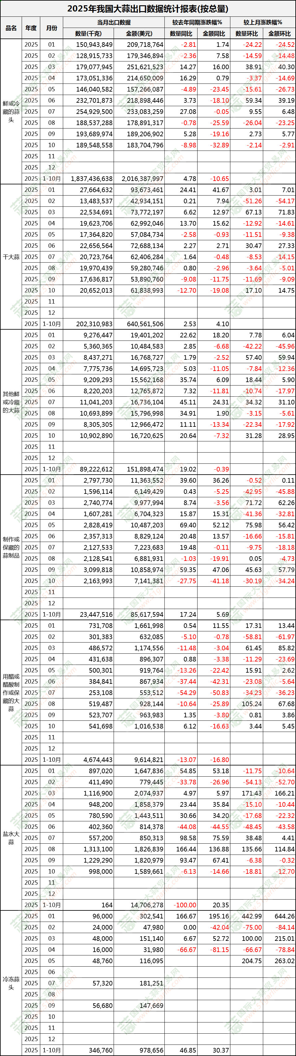 2025年10月大蒜出口數(shù)據(jù)(按總量)