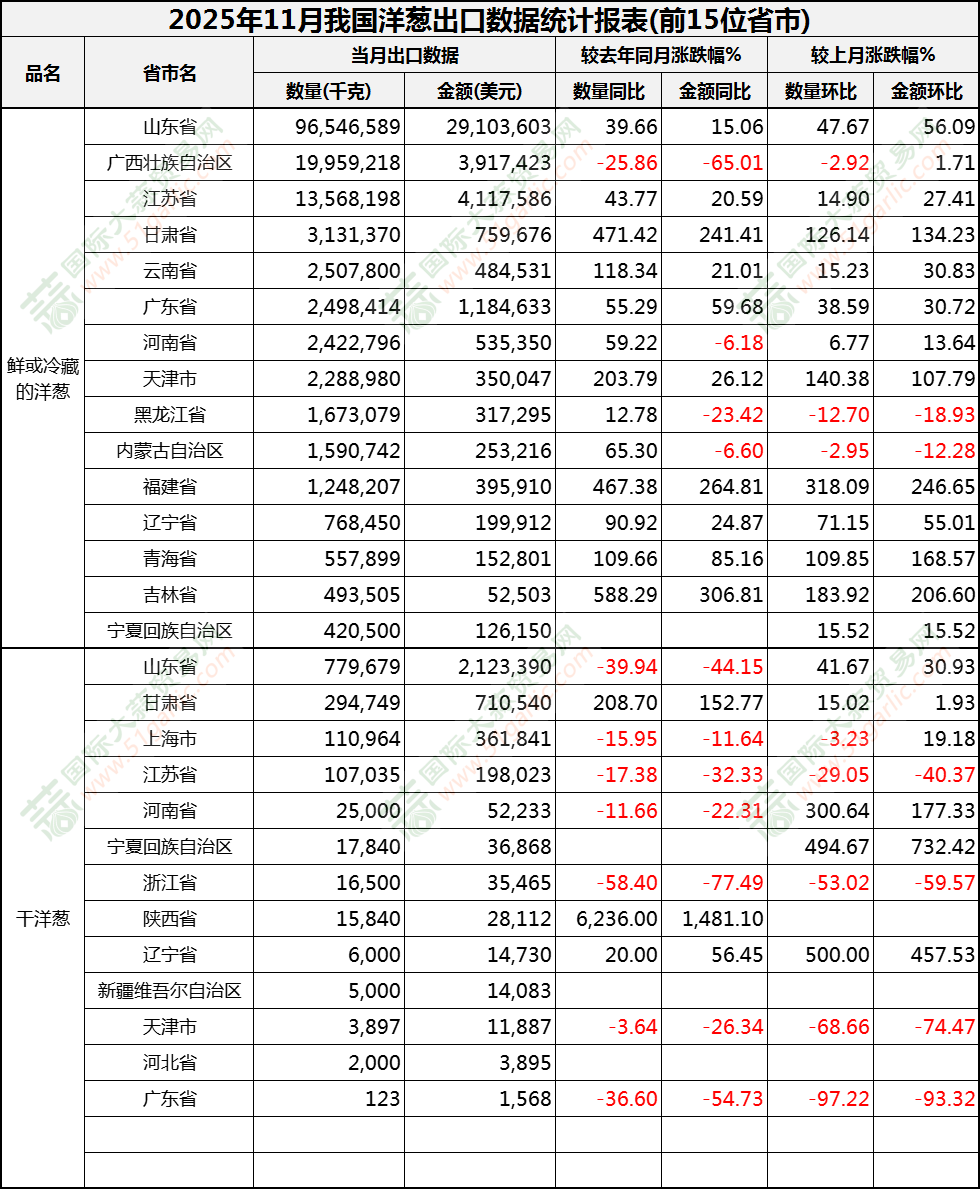 2025年11月洋蔥出口數(shù)據(jù)(按省市)