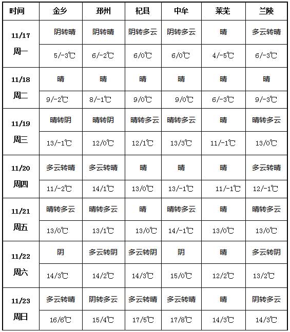 本周(11 月 17 日 - 23 日),金鄉(xiāng)、邳州、杞縣、中牟、萊蕪、蘭陵等產(chǎn)區(qū),天氣將以晴好或多云為主。周內(nèi)受寒潮影響,產(chǎn)區(qū)氣溫較上周大幅下降,局部地區(qū)降溫幅度達(dá) 10℃左右。11 月 17 日 - 18 日,寒意顯著。19 日之后,氣溫整體呈回升趨勢(shì),多地最高氣溫從月初的 5 - 9℃升至周末的 14 - 17℃,最低氣溫也從零下回升至 0 - 8℃。全周無降水。