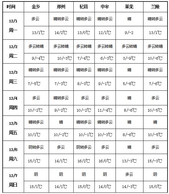 未來一周(12月1日-7日),金鄉(xiāng)、邳州、杞縣、中牟、萊蕪、蘭陵六大產(chǎn)區(qū)天氣將以晴朗或多云為主,整體天氣狀況良好,周內(nèi)基本無降水。
